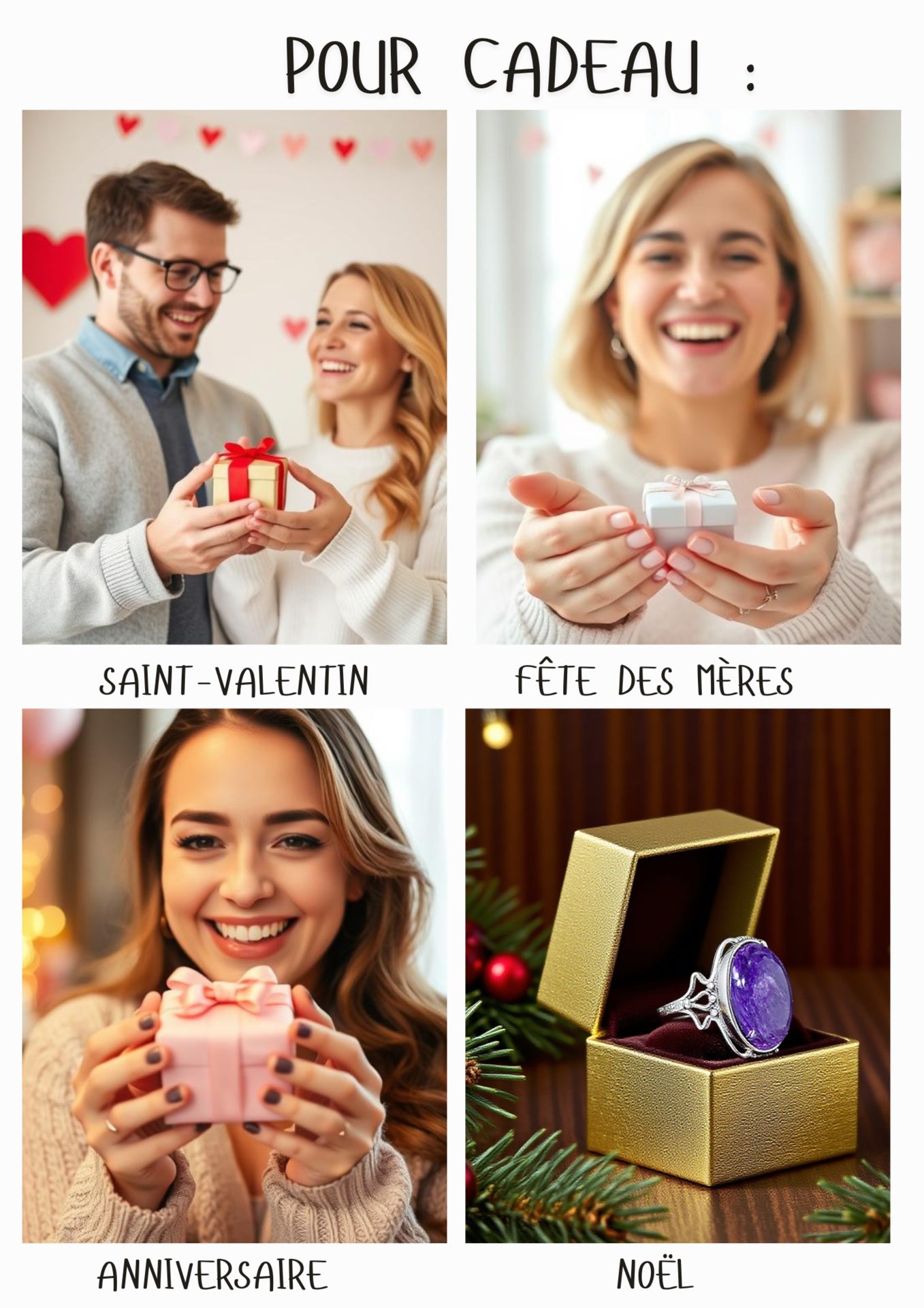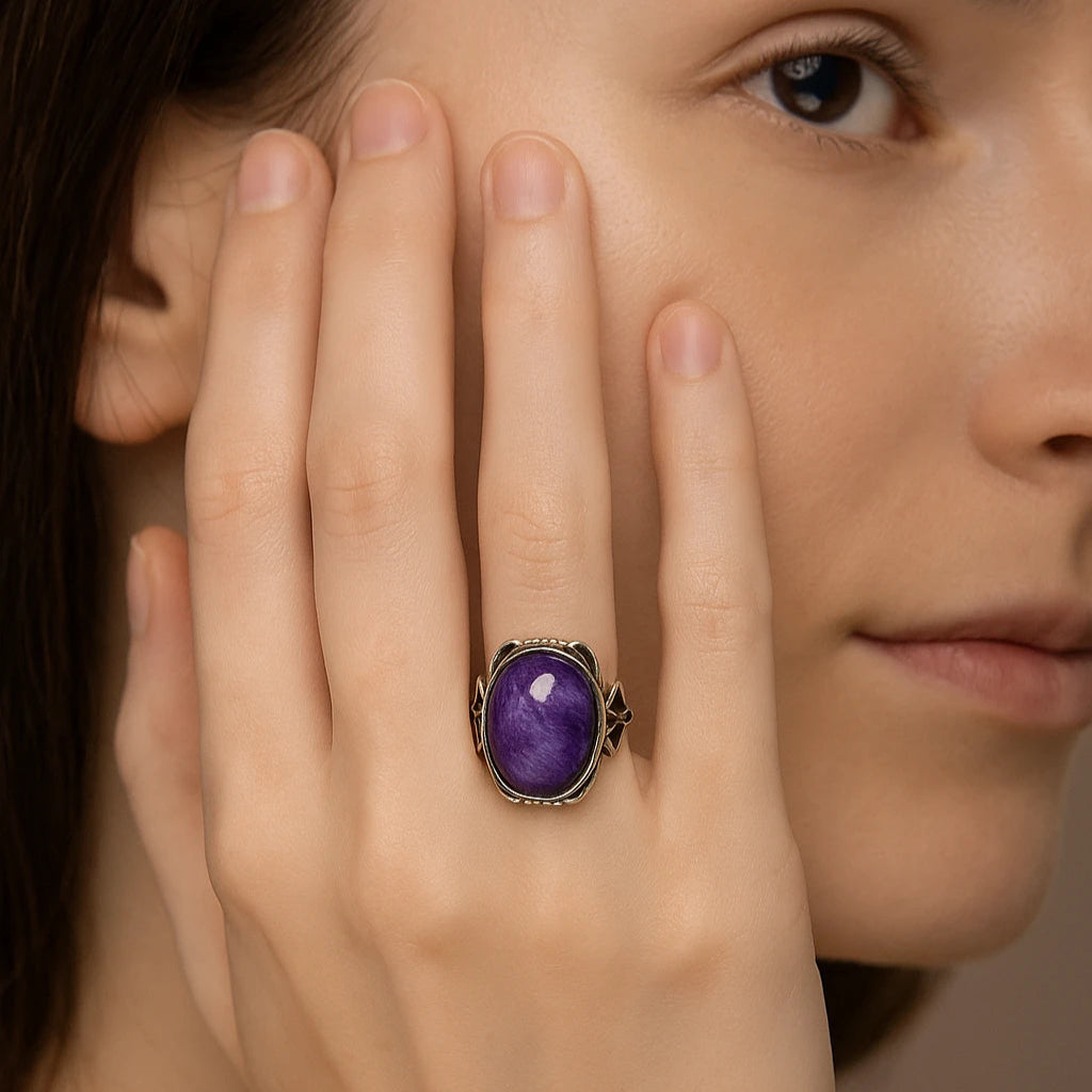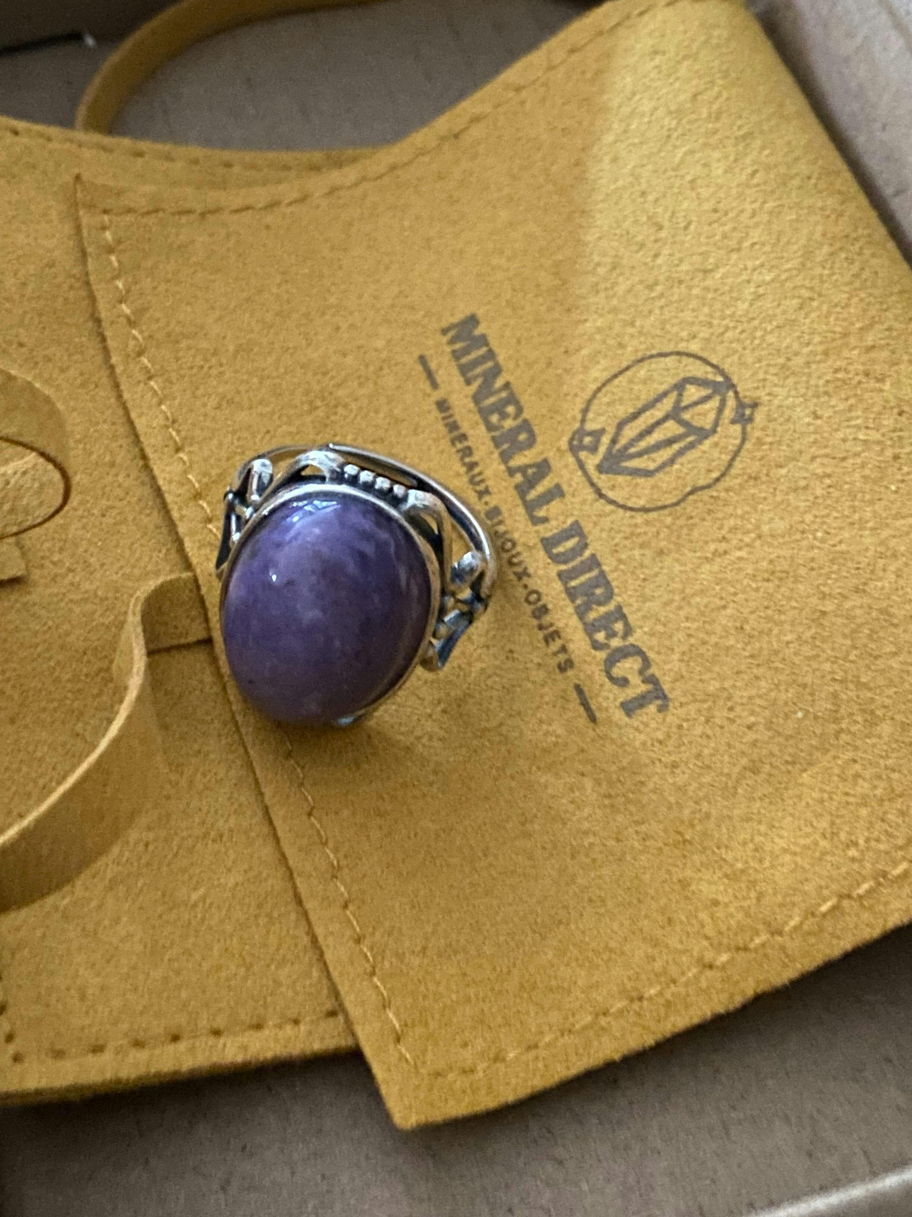 Je suis ravie de ma bague en charoïte ! La pierre est encore plus belle en vrai, avec ses nuances violettes uniques. La qualité est excellente et elle est très confortable à porter. Je la recommande vivement !
