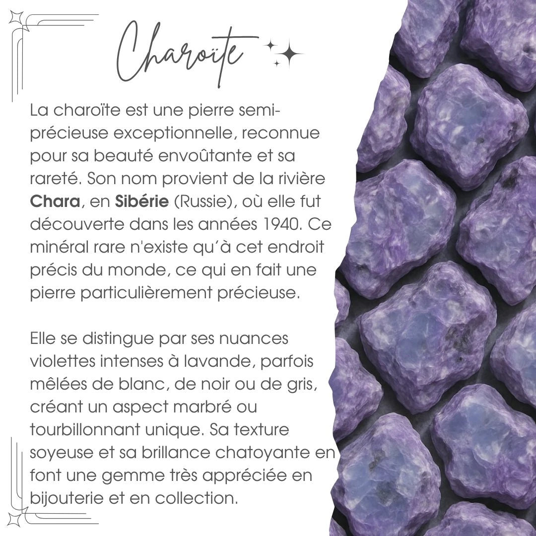 Élégante et spirituelle, cette bague ornée de Charoïte naturelle révèle toute la profondeur de cette pierre rare aux reflets violets fascinants. Connue pour accompagner les grandes transformations intérieures, elle aide à dépasser les peurs, à apaiser le mental et à ouvrir la voie de l’intuition et de la sérénité.