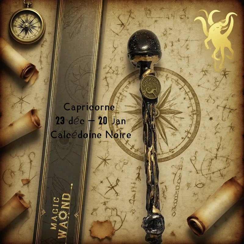 La baguette du Capricorne, ornée de calcédoine noire, symbolise la détermination, la discipline et la persévérance. Elle favorise la stabilité et la force intérieure.