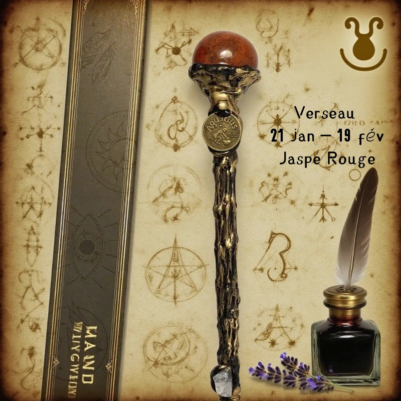 La baguette du Verseau, enrichie de jaspe rouge, incarne l’indépendance, l’audace et la créativité visionnaire. Cette pierre dynamise et stimule l’innovation.
