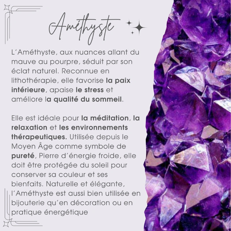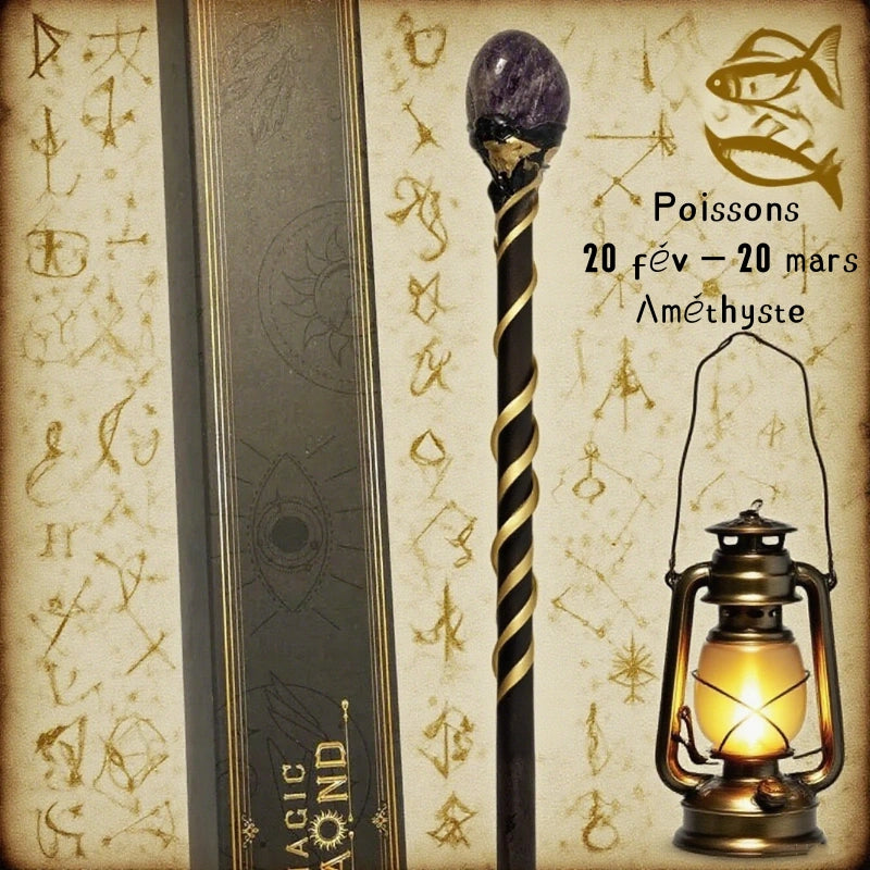 La baguette des Poissons, sertie d’améthyste, exprime la sensibilité, la spiritualité et l’imagination. Elle apaise, protège et ouvre à l’inspiration intérieure.