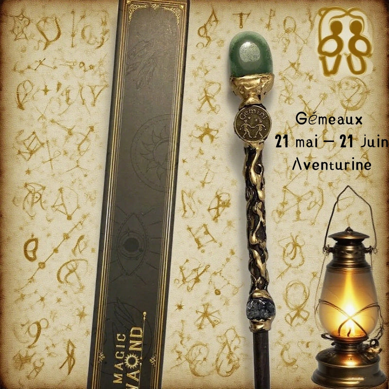 La baguette des Gémeaux, illuminée par l’aventurine, incarne la légèreté, la créativité et l’ouverture d’esprit. Cette pierre stimule l’optimisme et l’harmonie.