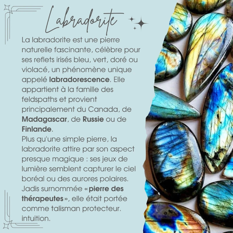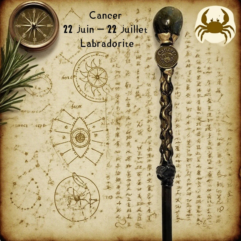 La baguette du Cancer, ornée de la labradorite, exprime la sensibilité et la protection. Cette pierre magique apaise et renforce l’intuition naturelle du signe.