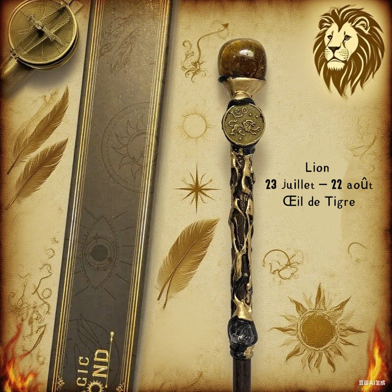 La baguette du Lion, enrichie de l’œil-de-tigre, incarne la puissance, la confiance et le rayonnement. Cette pierre protège et amplifie le courage du signe solaire.