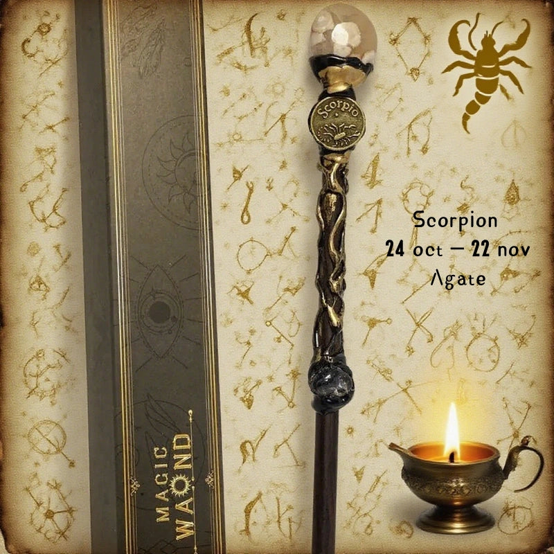 La baguette du Scorpion, sertie d’agate, incarne la profondeur, la transformation et la force intérieure. Cette pierre protège et stabilise les émotions intenses.
