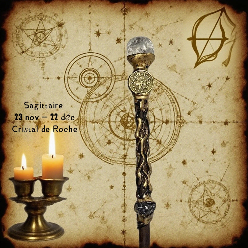 La baguette du Sagittaire, illuminée par le cristal de roche, reflète l’aventure, la quête de vérité et l’expansion spirituelle. Elle amplifie l’énergie et la clarté.