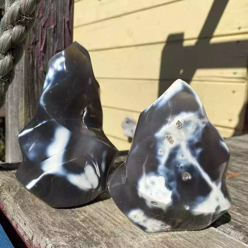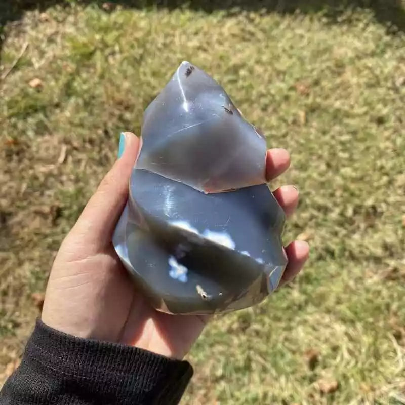 Laissez-vous captiver par la Flamme en Agate Orque, une pierre naturelle aux contrastes puissants de noir, de gris et de blanc. Sa forme en flamme symbolise l’énergie qui s’élève, la transformation et la force intérieure.