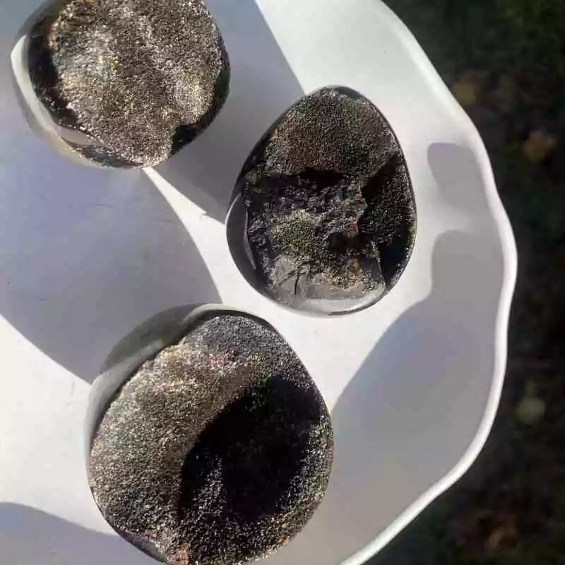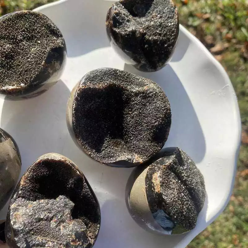- Amas de Cristaux : Disposez votre pierre de septaria sur un amas de cristaux comme l'améthyste ou le quartz clair. Ces cristaux ont des propriétés énergétiques qui aident à la recharge.