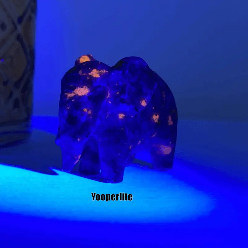 Yooperlite : Une pierre récemment découverte qui brille sous la lumière ultraviolette, révélant des motifs fluorescents jaunes ou orange dus à la présence de sodalite.