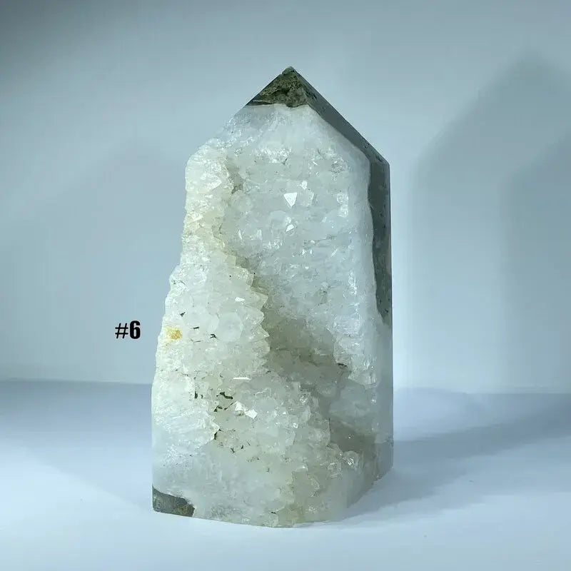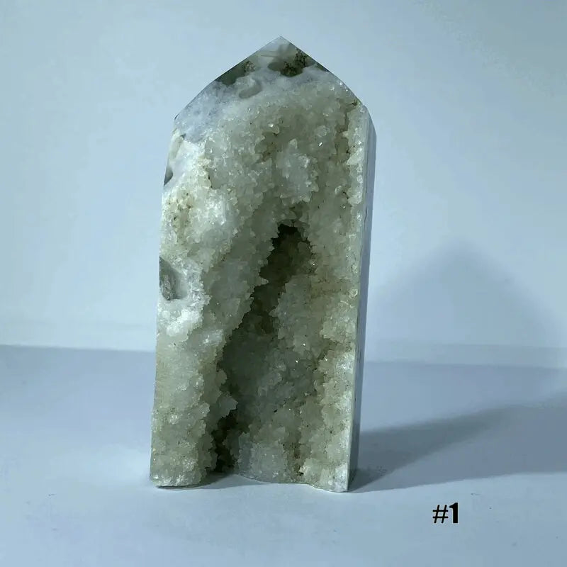 La présence de druse amplifie l’énergie de la pierre et ajoute une touche magique à cette création naturelle. Parfaite pour la méditation, la décoration ou pour accompagner vos pratiques énergétiques au quotidien.