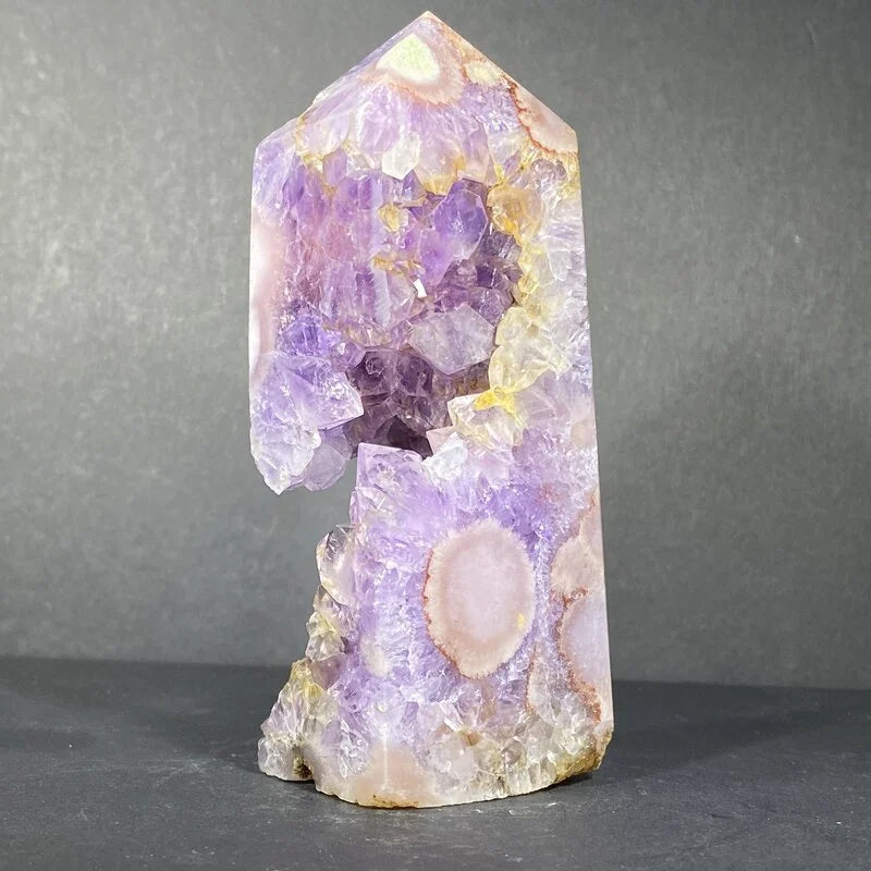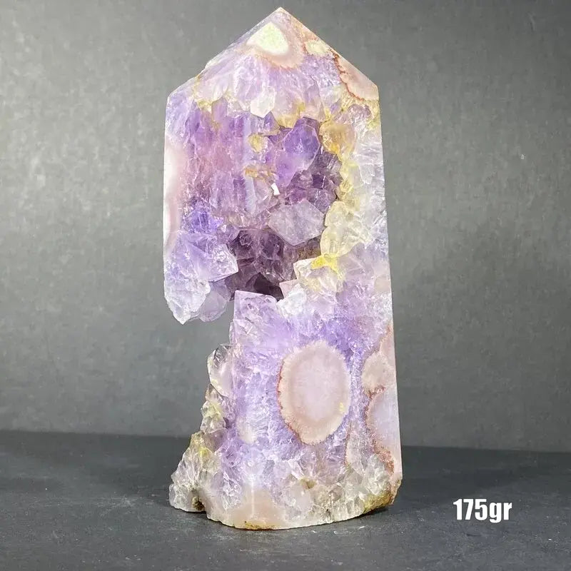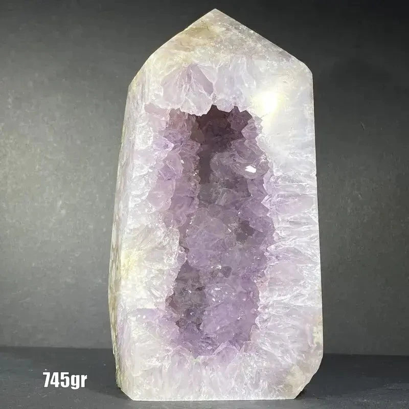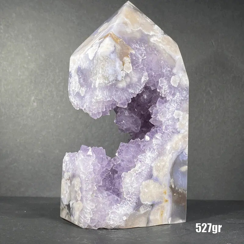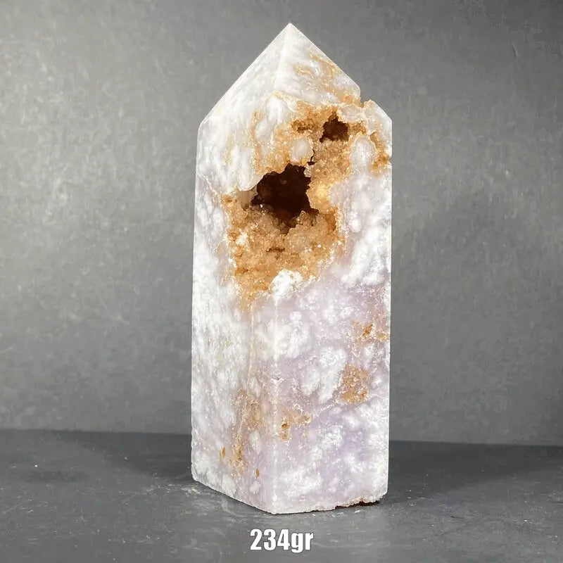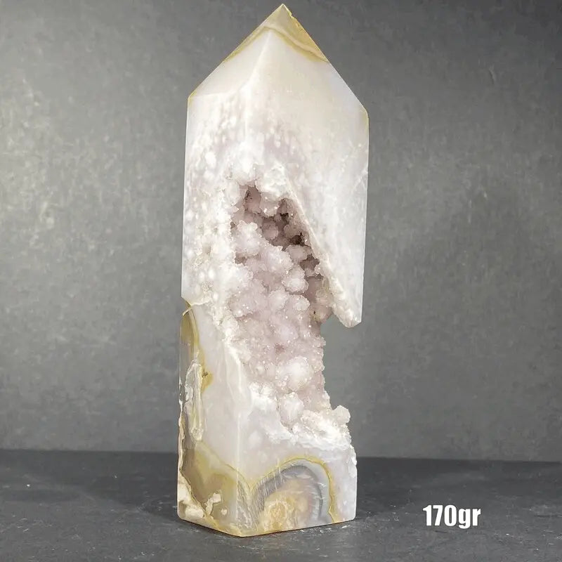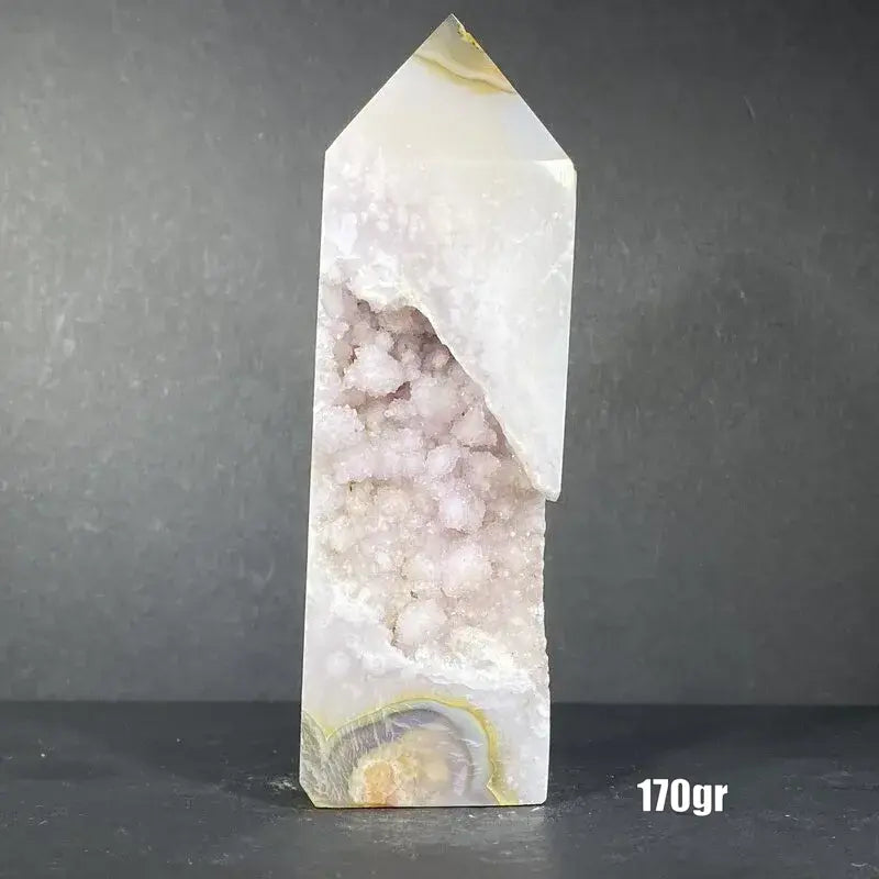 La druse scintillante révèle un cœur cristallin vibrant, amplifiant l’énergie de la pierre et ajoutant une touche de magie à chaque pièce. Cette pointe est idéale pour harmoniser un espace, ancrer les énergies et embellir vos rituels ou votre intérieur.