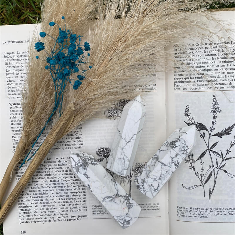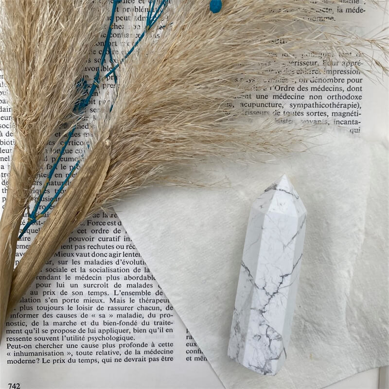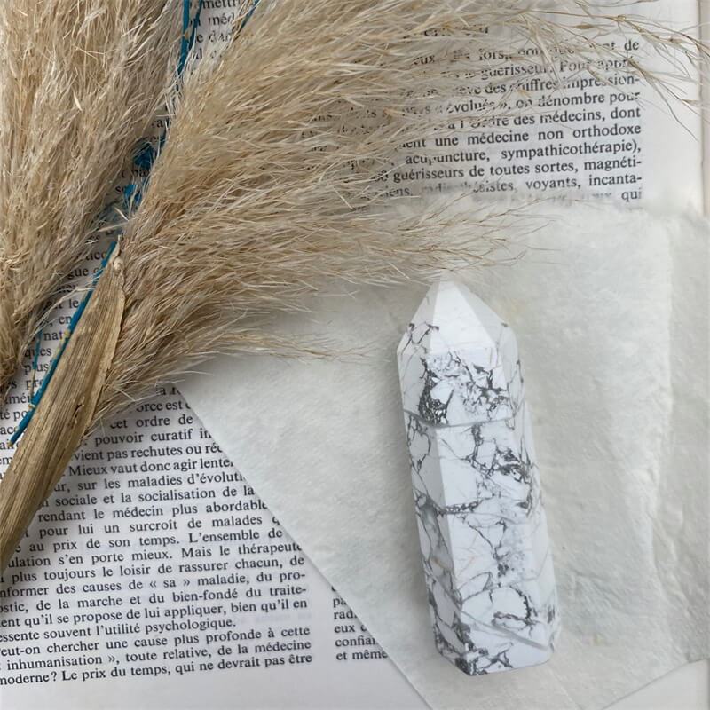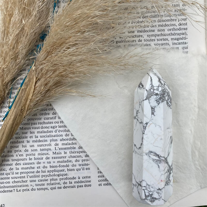 - La pointe de howlite est souvent utilisée pour favoriser la clarté mentale et la concentration.
